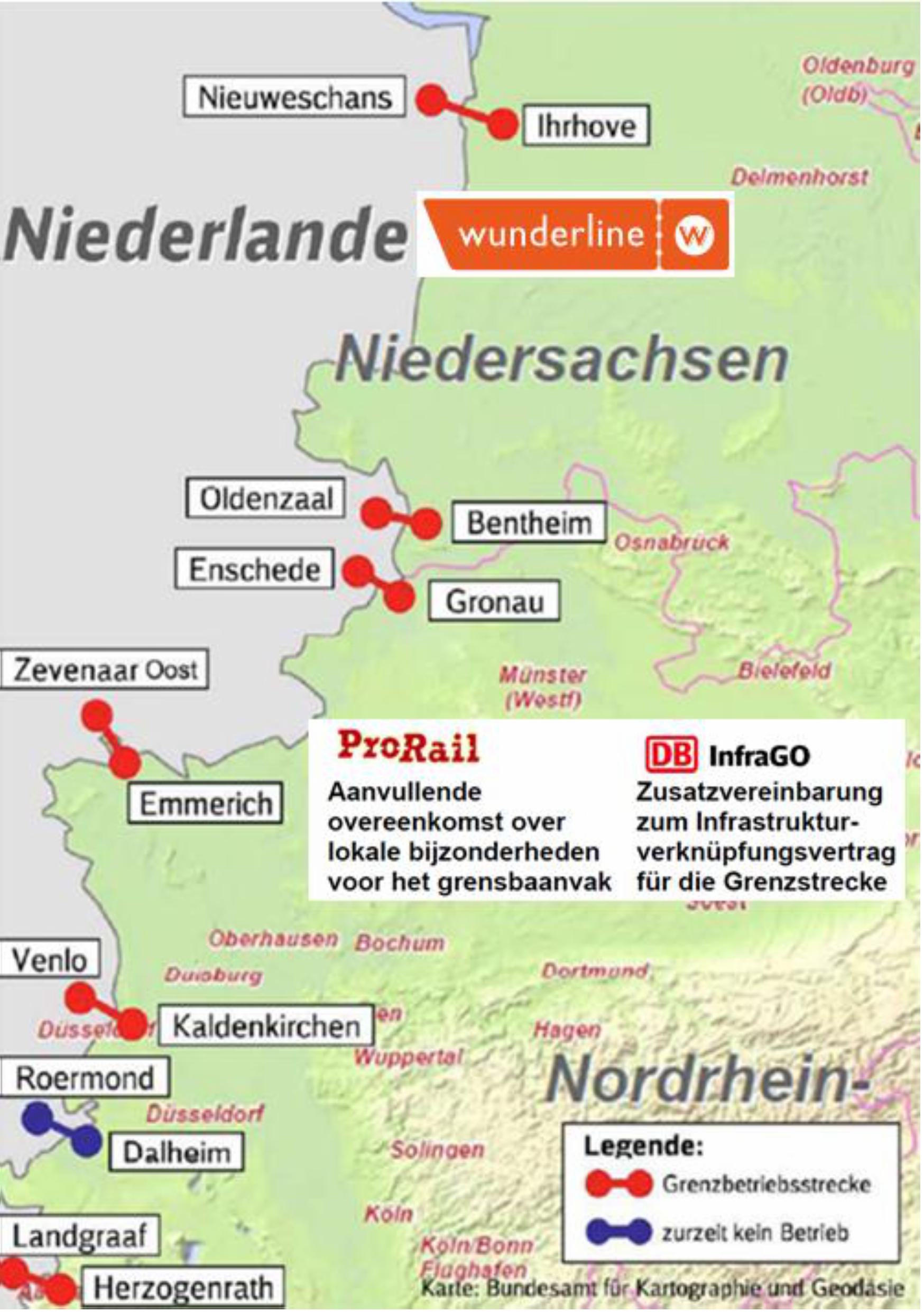DB InfraGO und ProRail haben kürzlich die neuen Zusatzvereinbarung zum Infrastrukturverknüpfungsvertrag für die Grenzstrecke Ihrhove – Bad Nieuweschans unterzeichnet. Diese Vereinbarung ist notwendig, da die Wunderline im kommenden Sommer in Betrieb genommen wird und die alte Vereinbarung aus dem Jahr 2015 stammt. Es enthält Regeln für die Verwaltung und Nutzung der Eisenbahnstrecke über die niederländisch-deutsche Grenze, in diesem Fall zwischen Bad Nieuweschans und Ihrhove. |